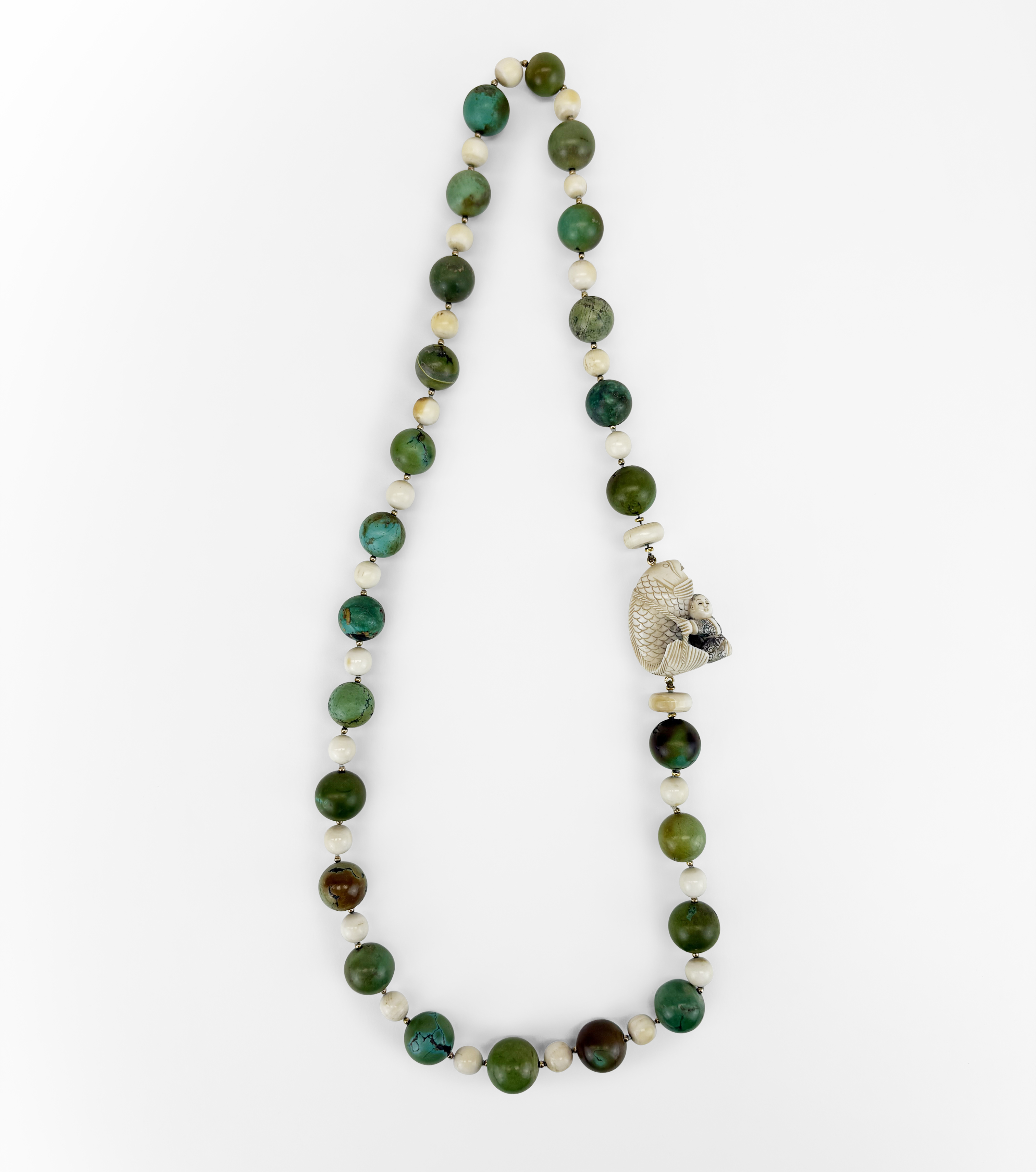 Perles de turquoise et ivoire à décor de netsuke, L 70 cm