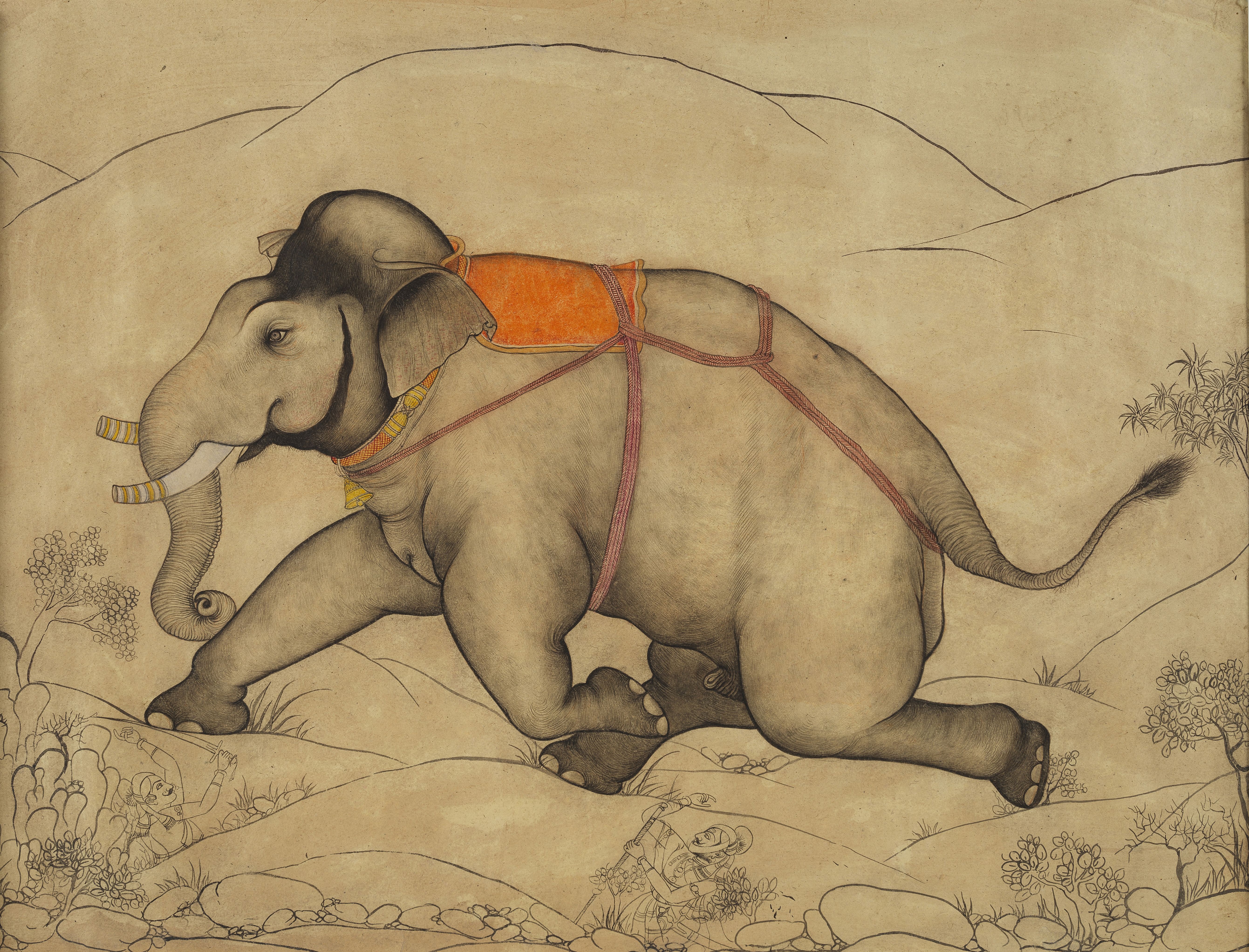 Eléphant harnaché, pigments et encre sur papier, 83x64 cm. Pour...