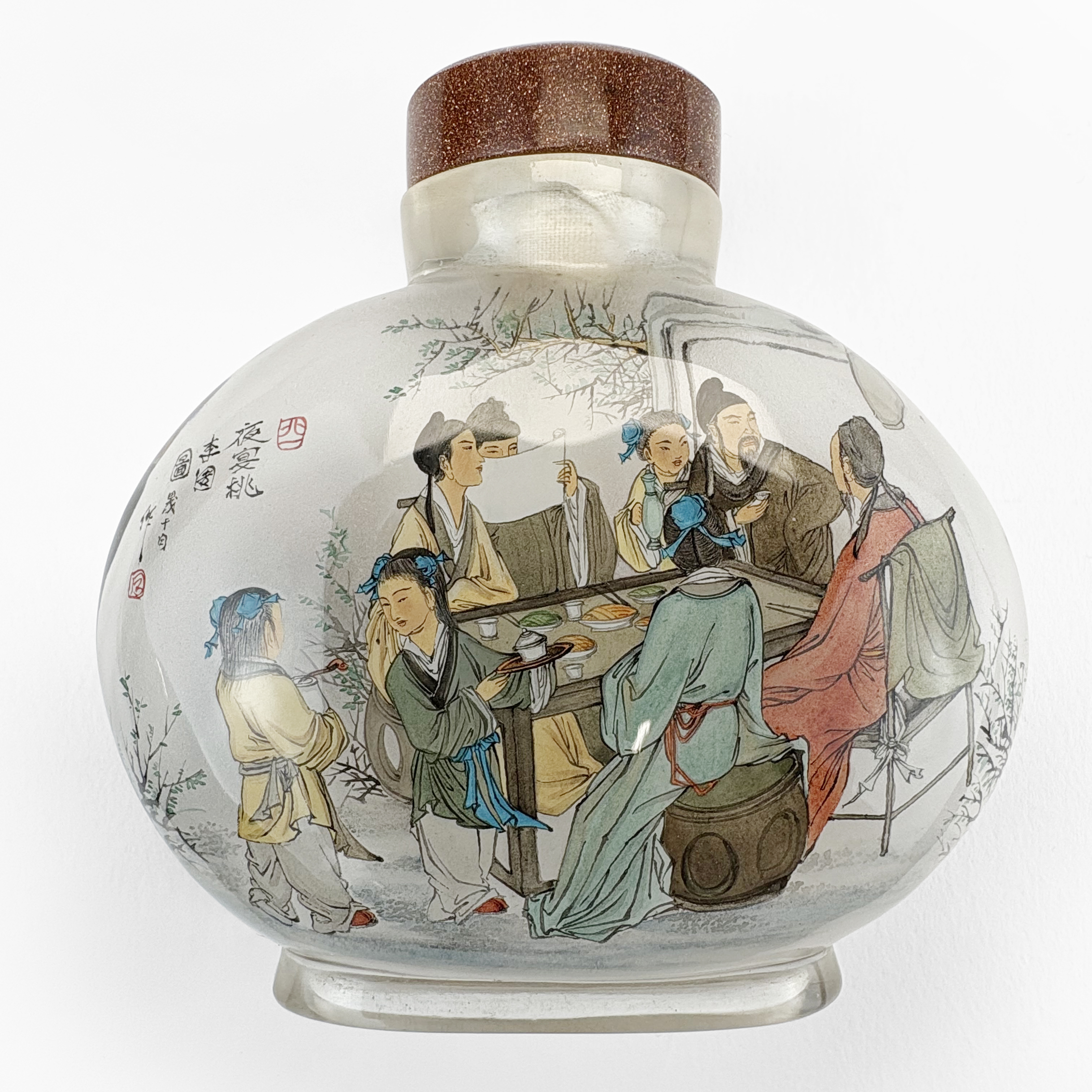 Verre à décor de personnages et calligraphie, bouchon en aventur...