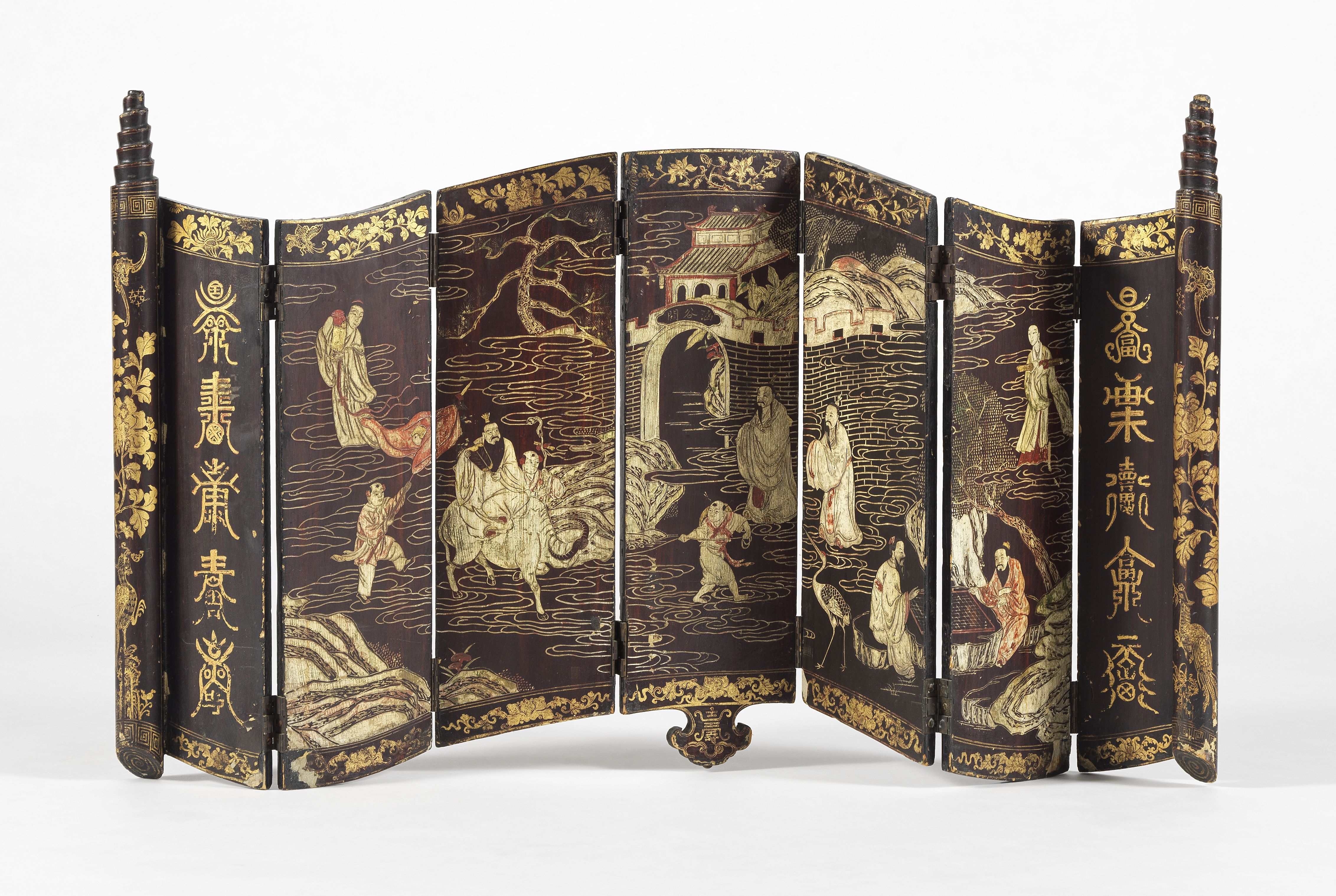 Bois sculpté et laqué à décor de charactères et personnages dans...