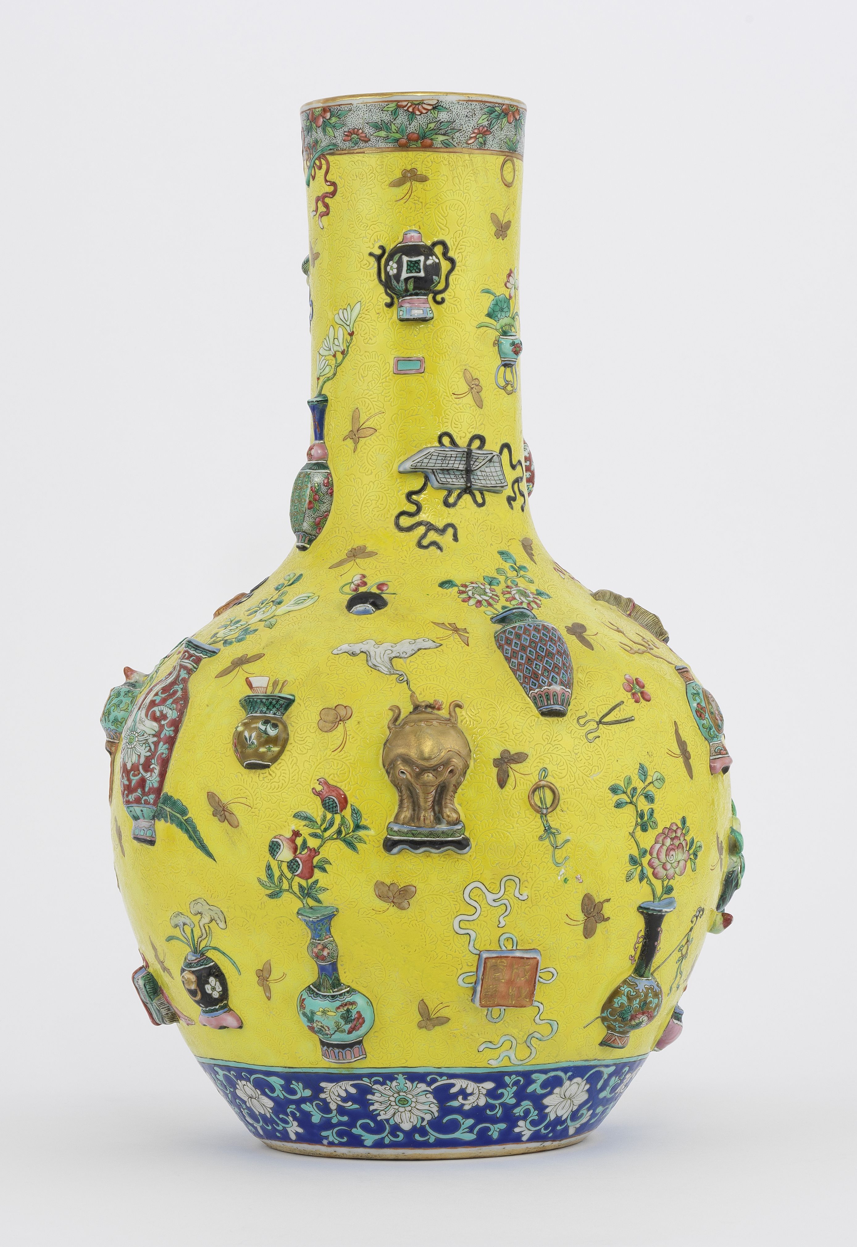 Porcelaine émaillée sur fond jaune à décor d'objets polychromes...