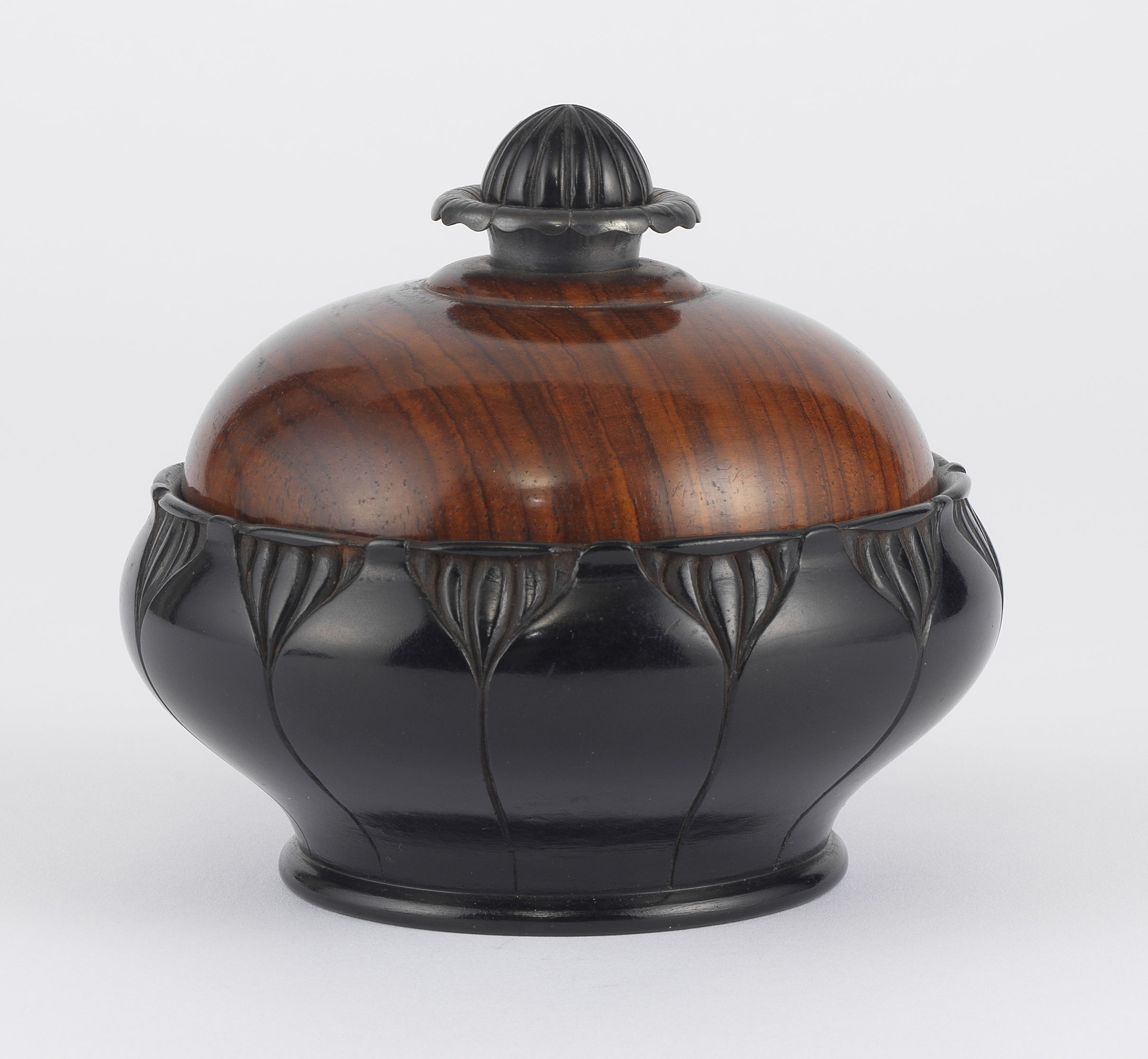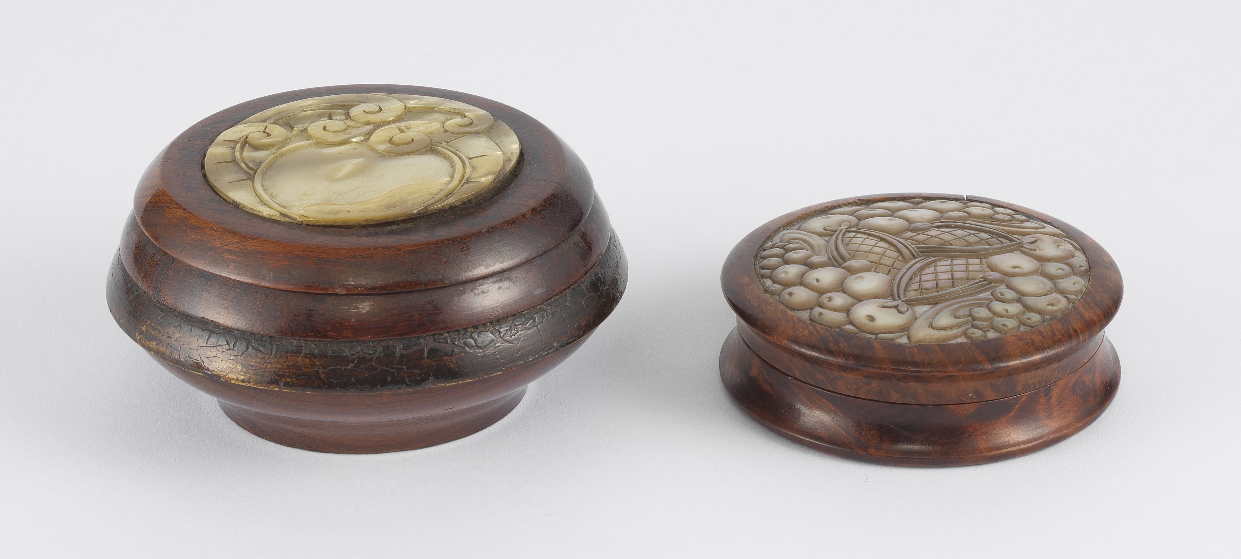 Couvercle en bois naturel et nacre, D 8,5 et 10 cm. Provenance:...