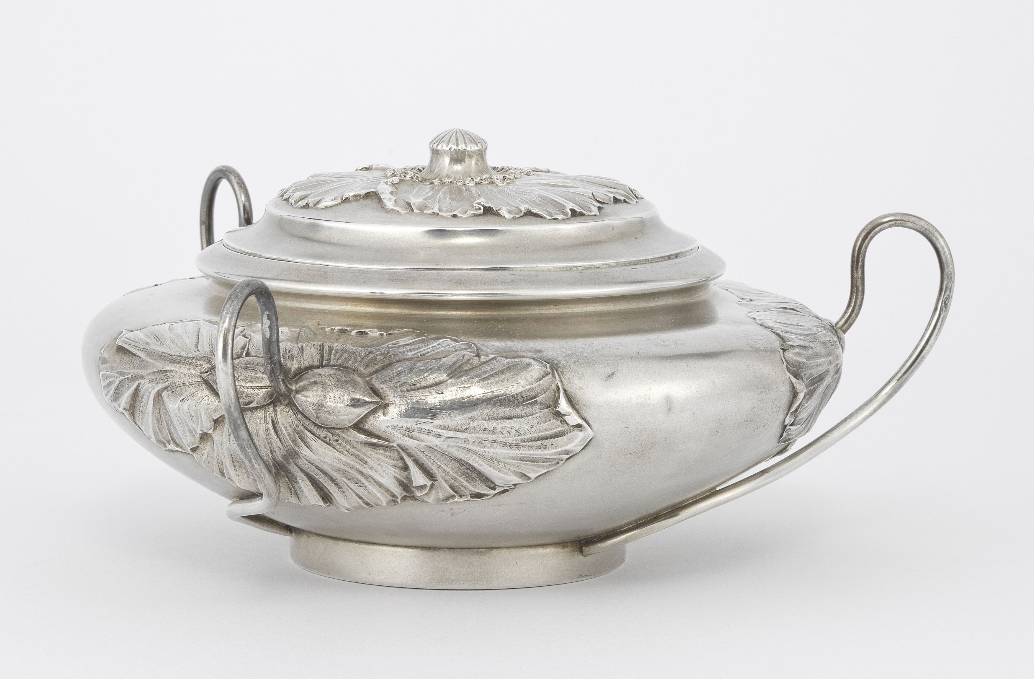 5451. Boîte ronde Art nouveau à trois anses et décor repoussé de pavot...