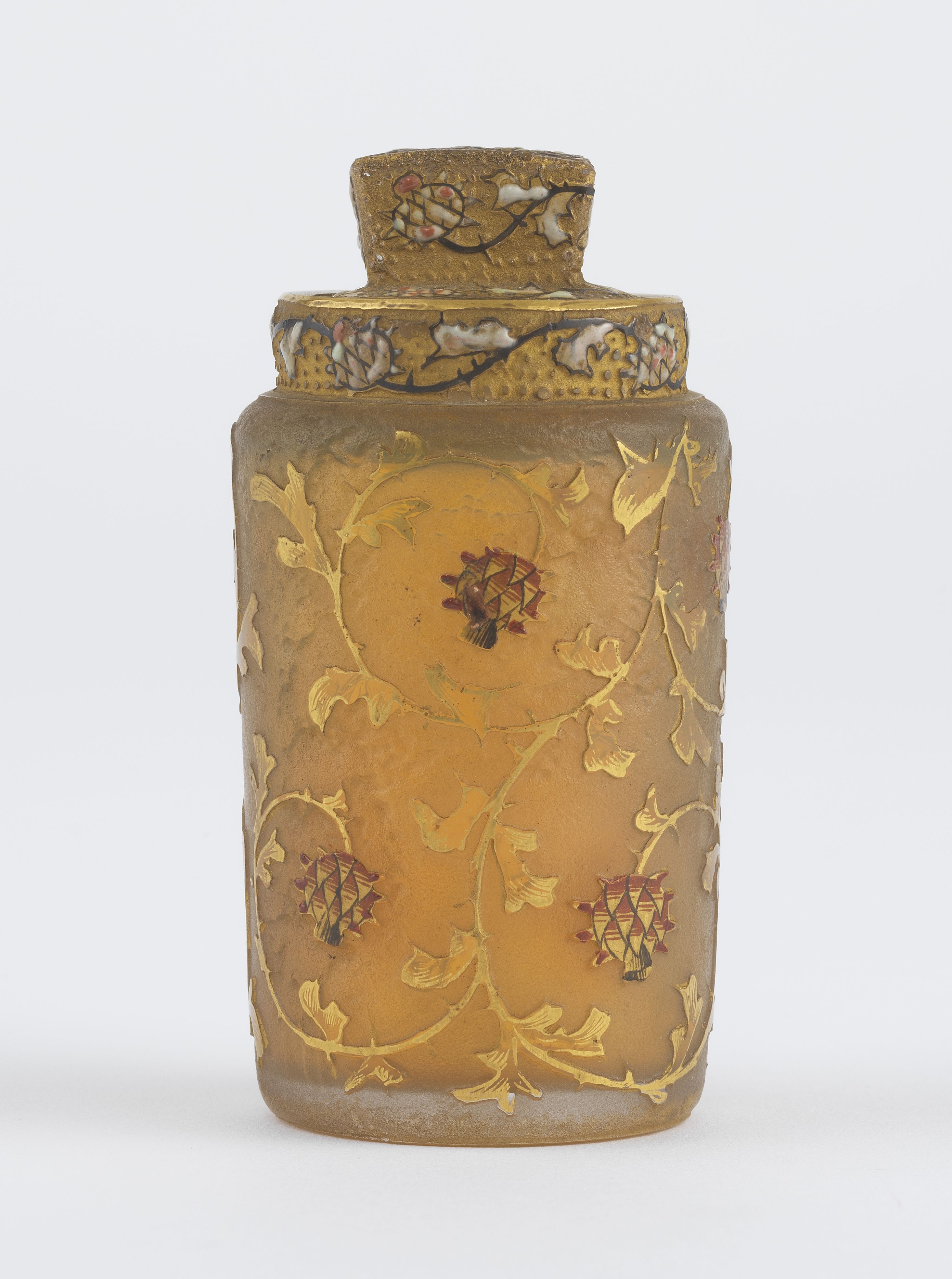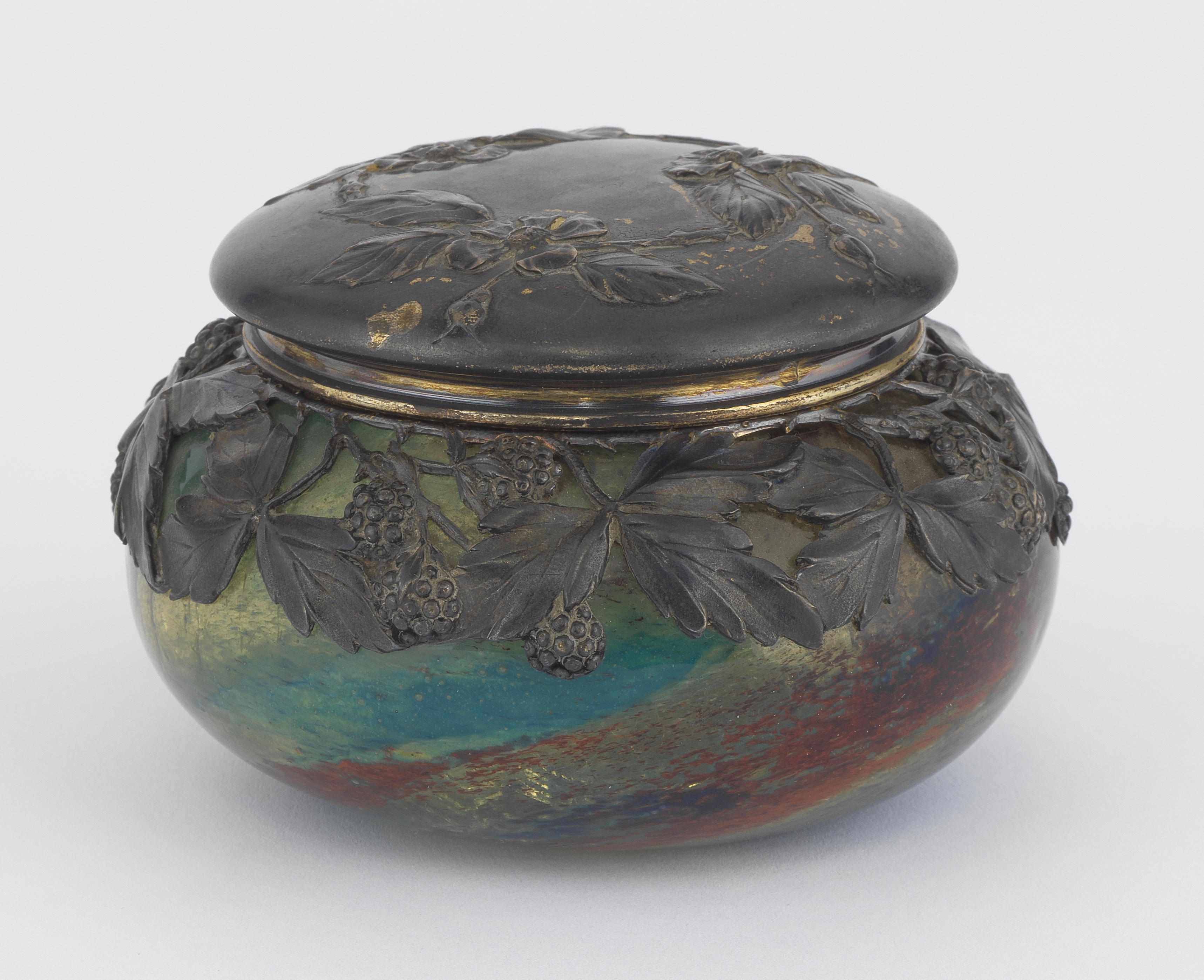Verre soufflé à décor de chardons, surmonté d'un couvercle en mé...