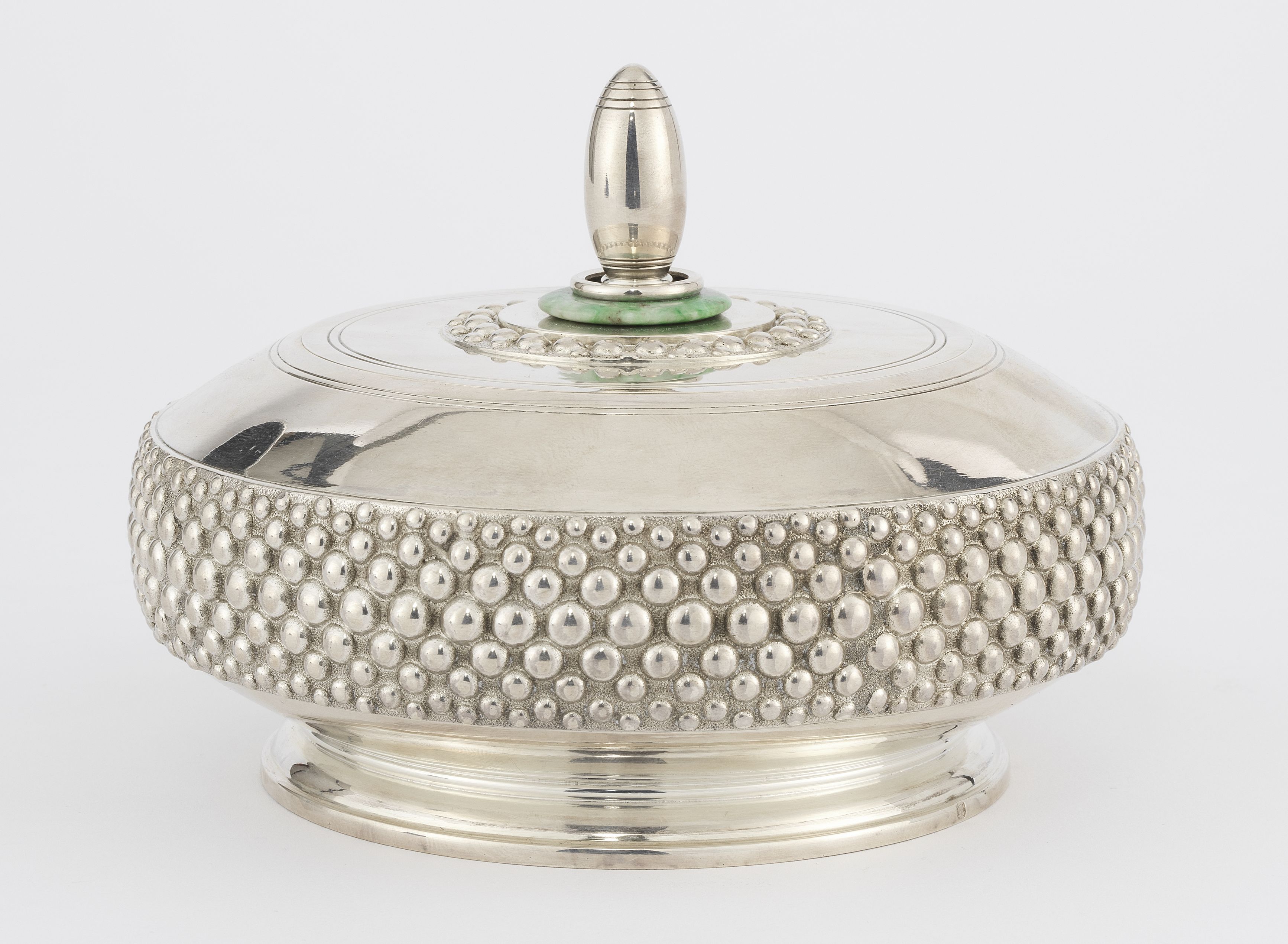 5455. Bonbonnière Art déco à motif de pastilles et bague en pierre dur...