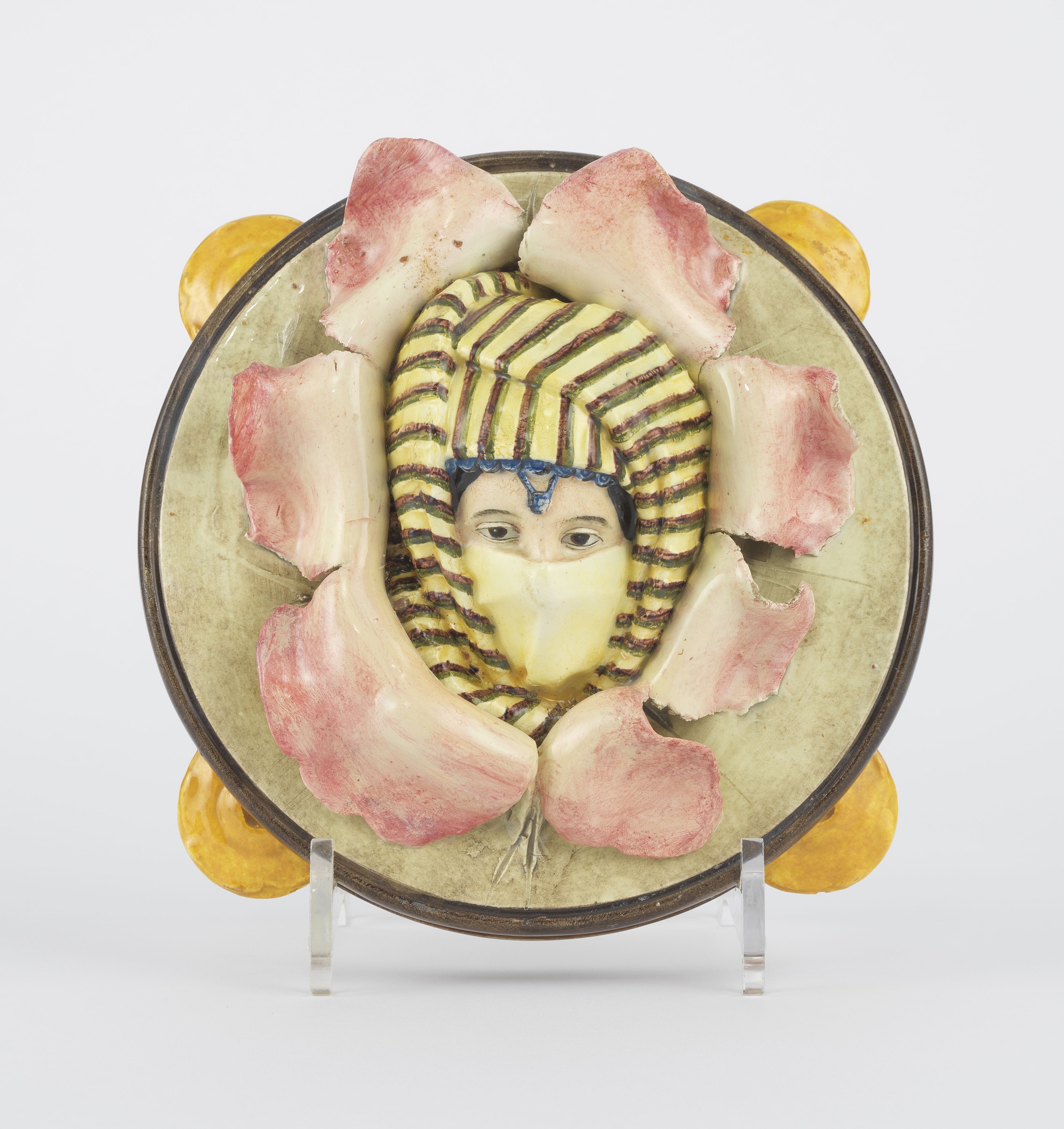 Applique en forme de tambourin à décor d'un visage masqué, faïen...