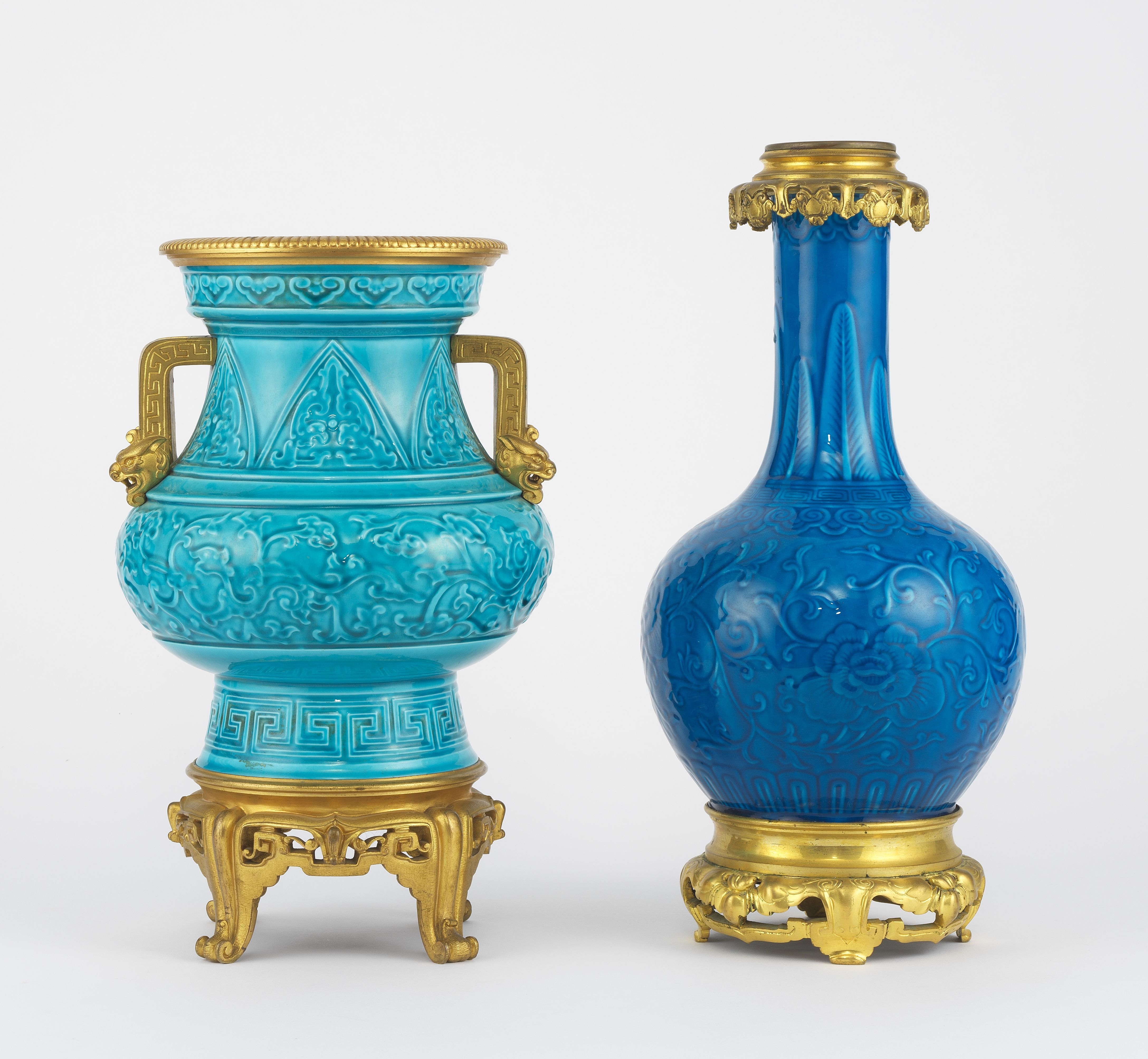 Faïence émaillée turquoise à motif de rinceaux, montés en bronze...