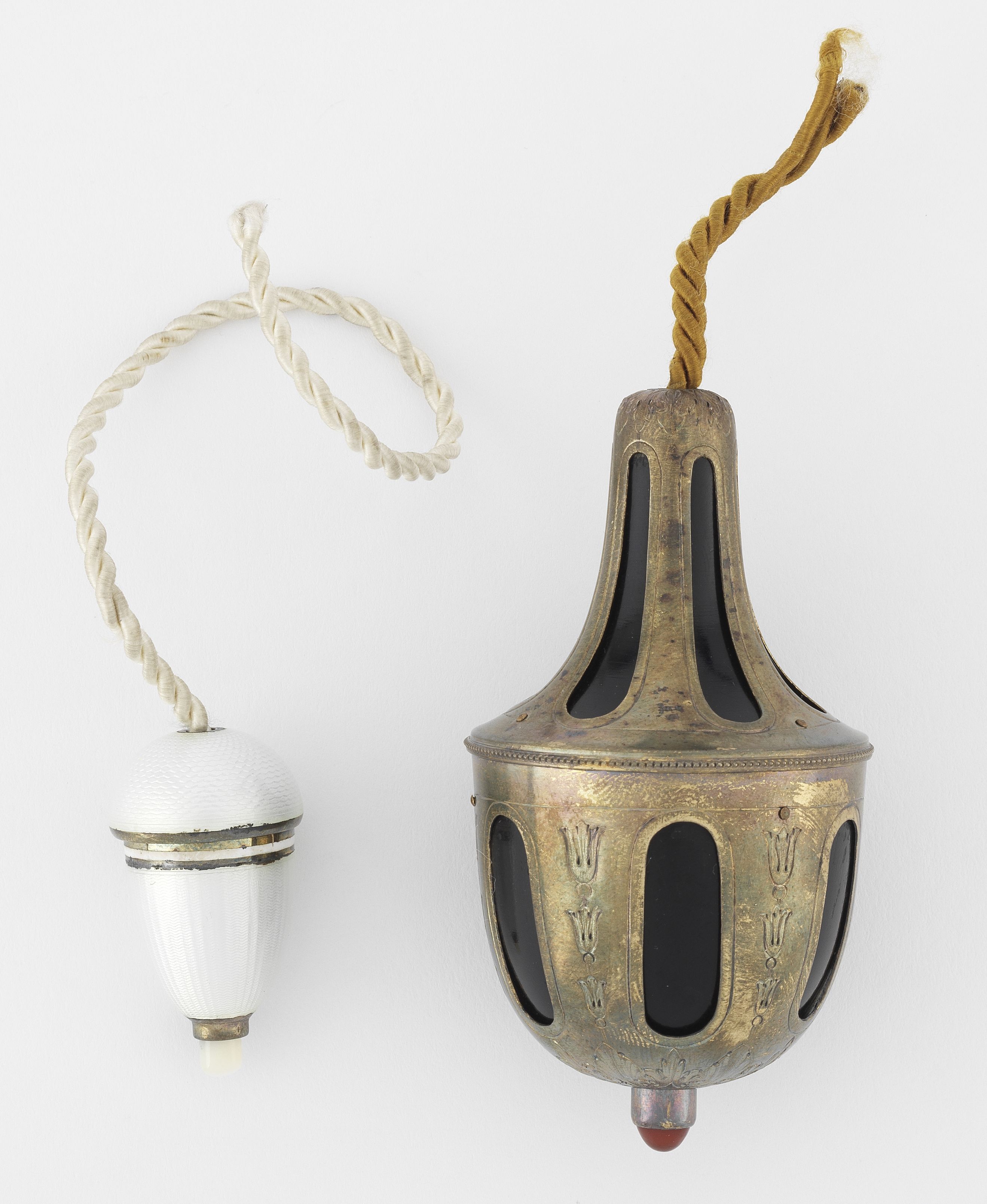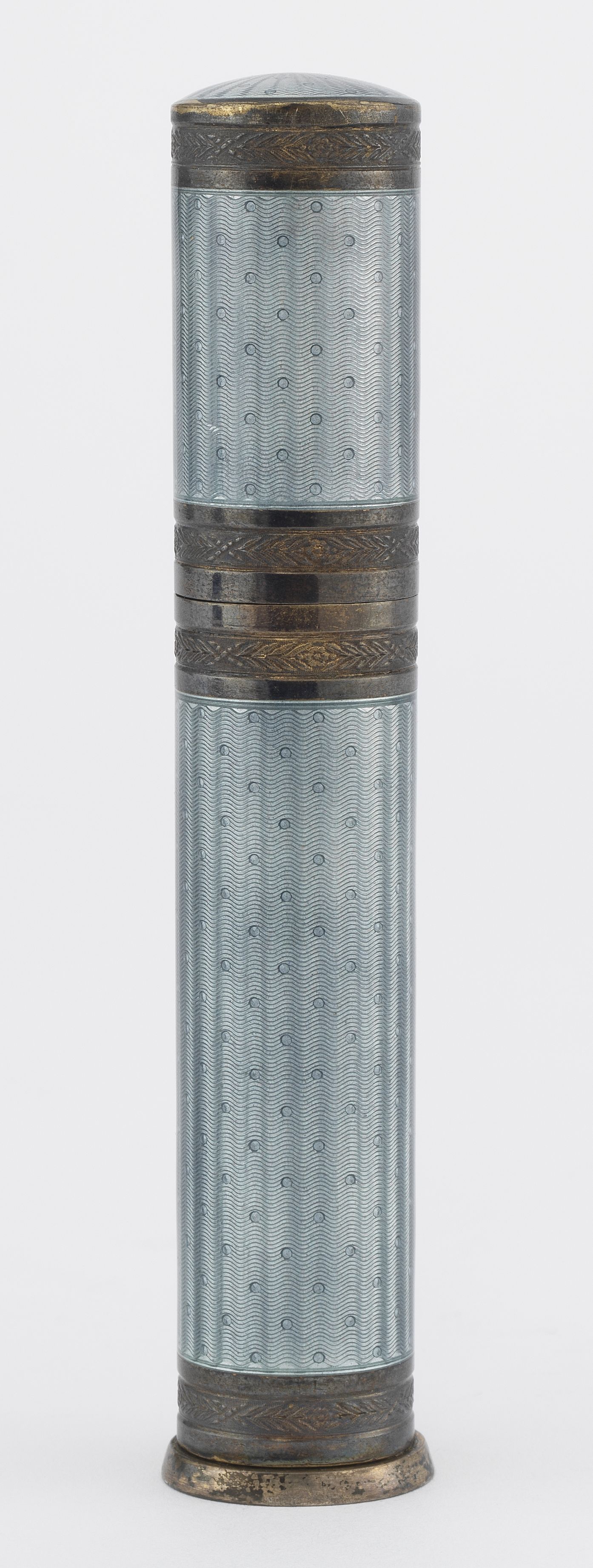 Argent émaillé blanc et gravé d'acanthes, H 3,5 et 7,5 cm. Prove...