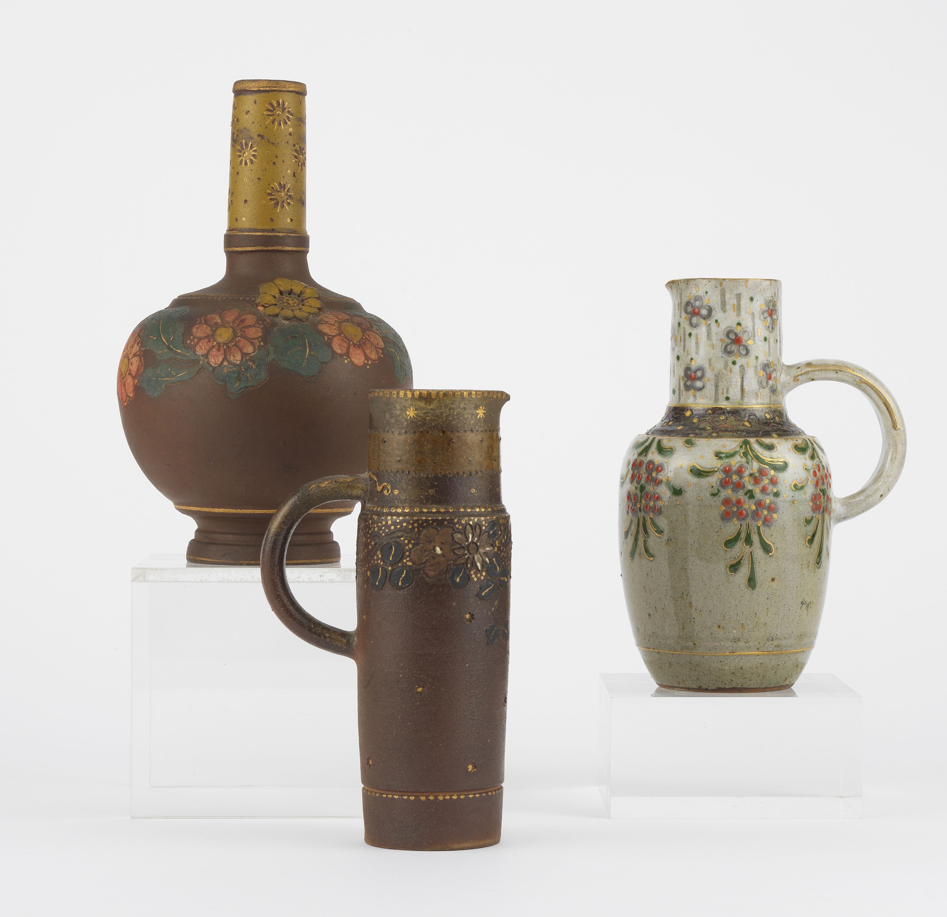 Deux pichets et un vase, grès émaillé polychrome sur fond gris e...