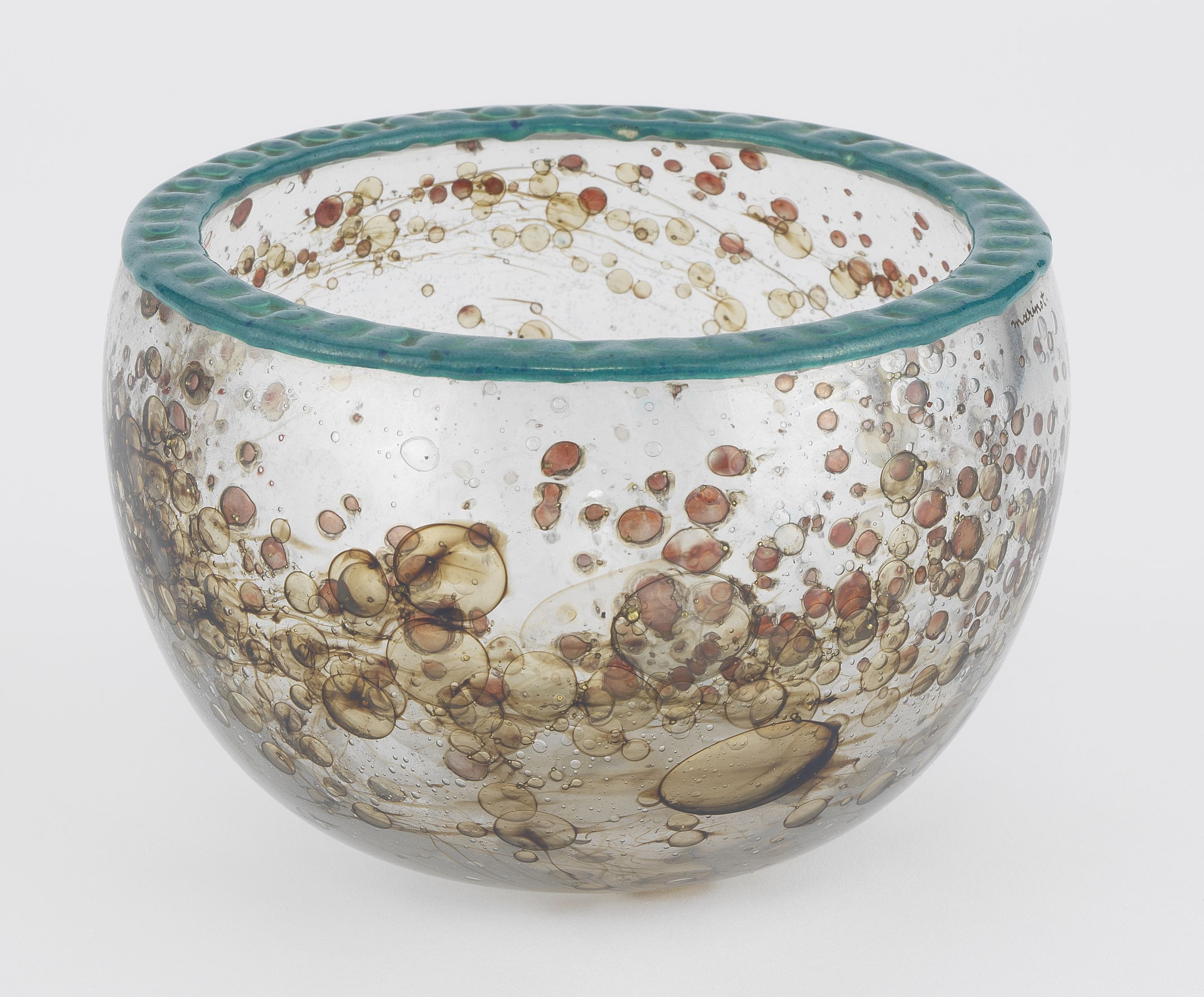 Coupe bulle, verre et bordure émaillée turquoise, signée, D 10,5...