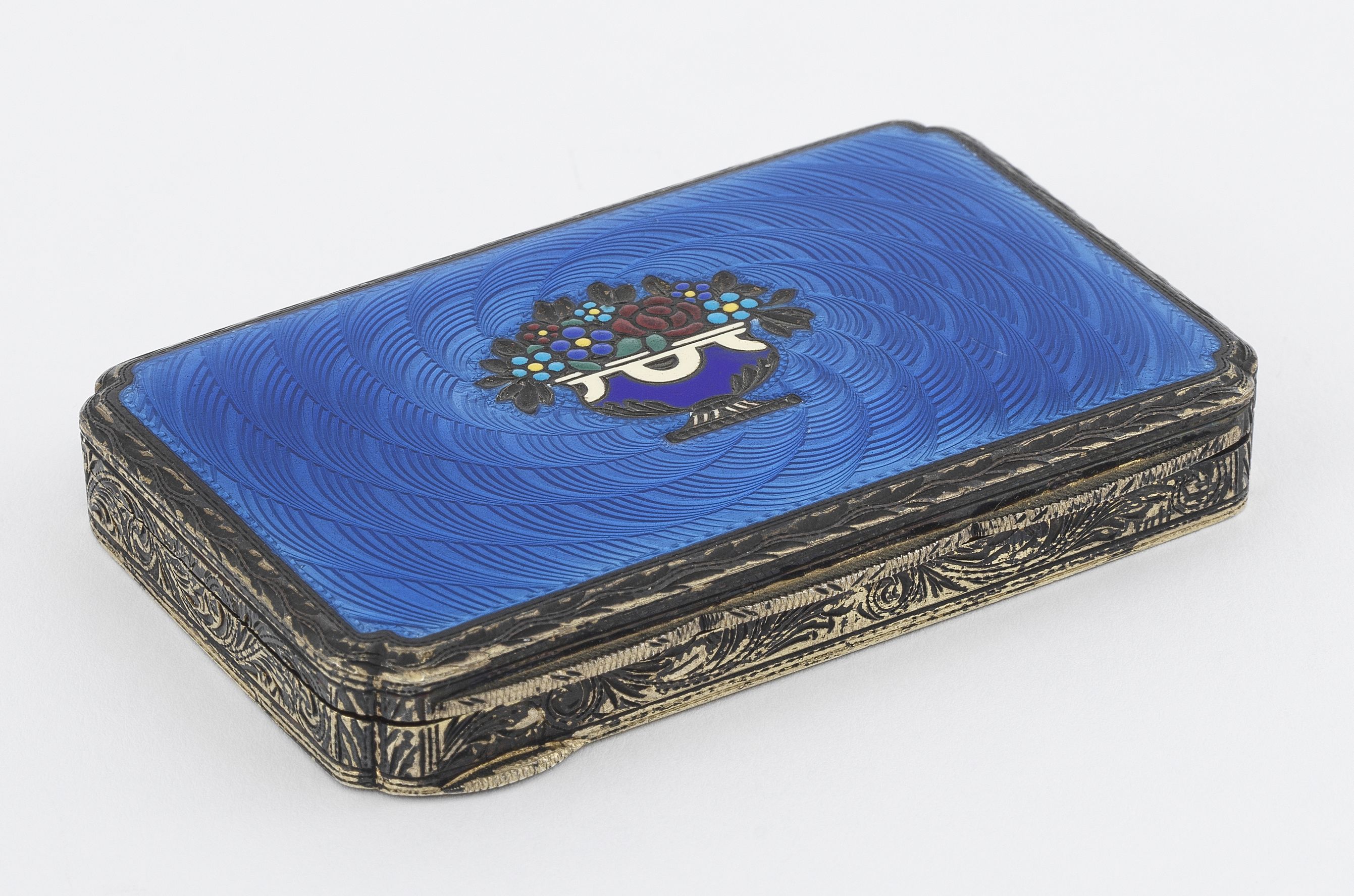 5468. Tabatière à décor émaillé d'un vase fleuri sur fond guilloché