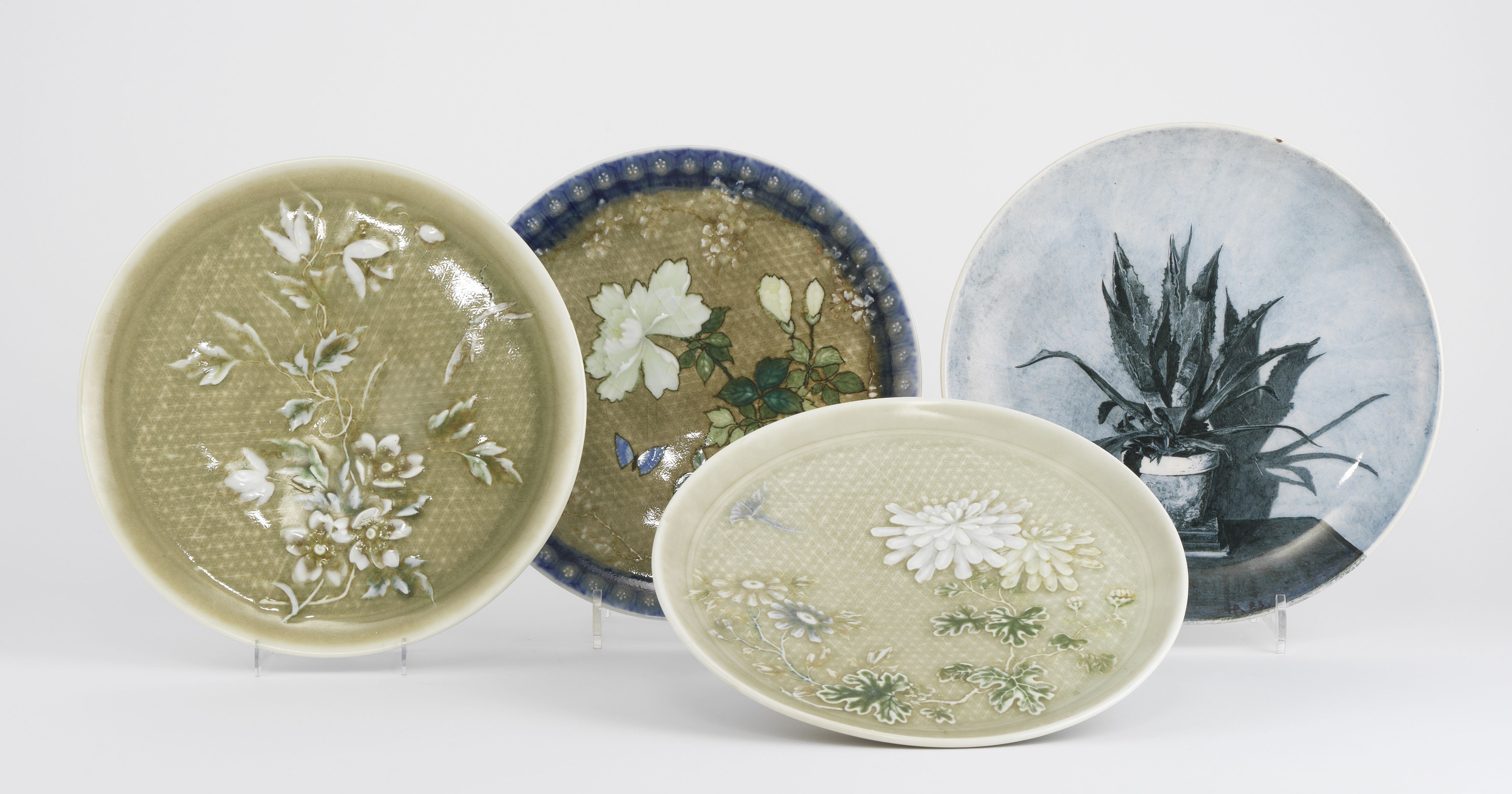 Suite de quatre plats, faïence émaillée polychrome à décor de fl...