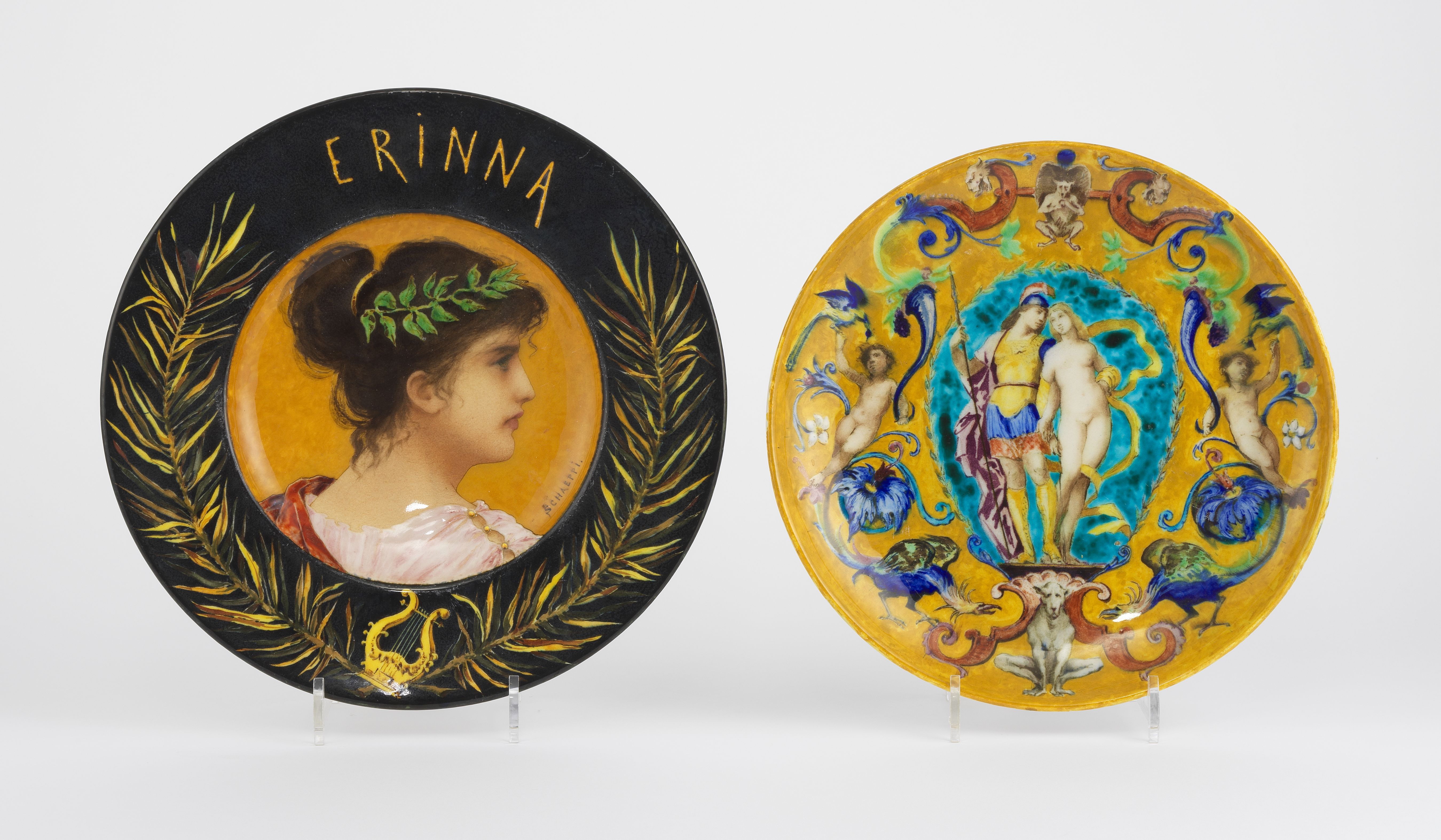 Deux plats, faïence émaillée, l'un à décor d'un profil de femme...