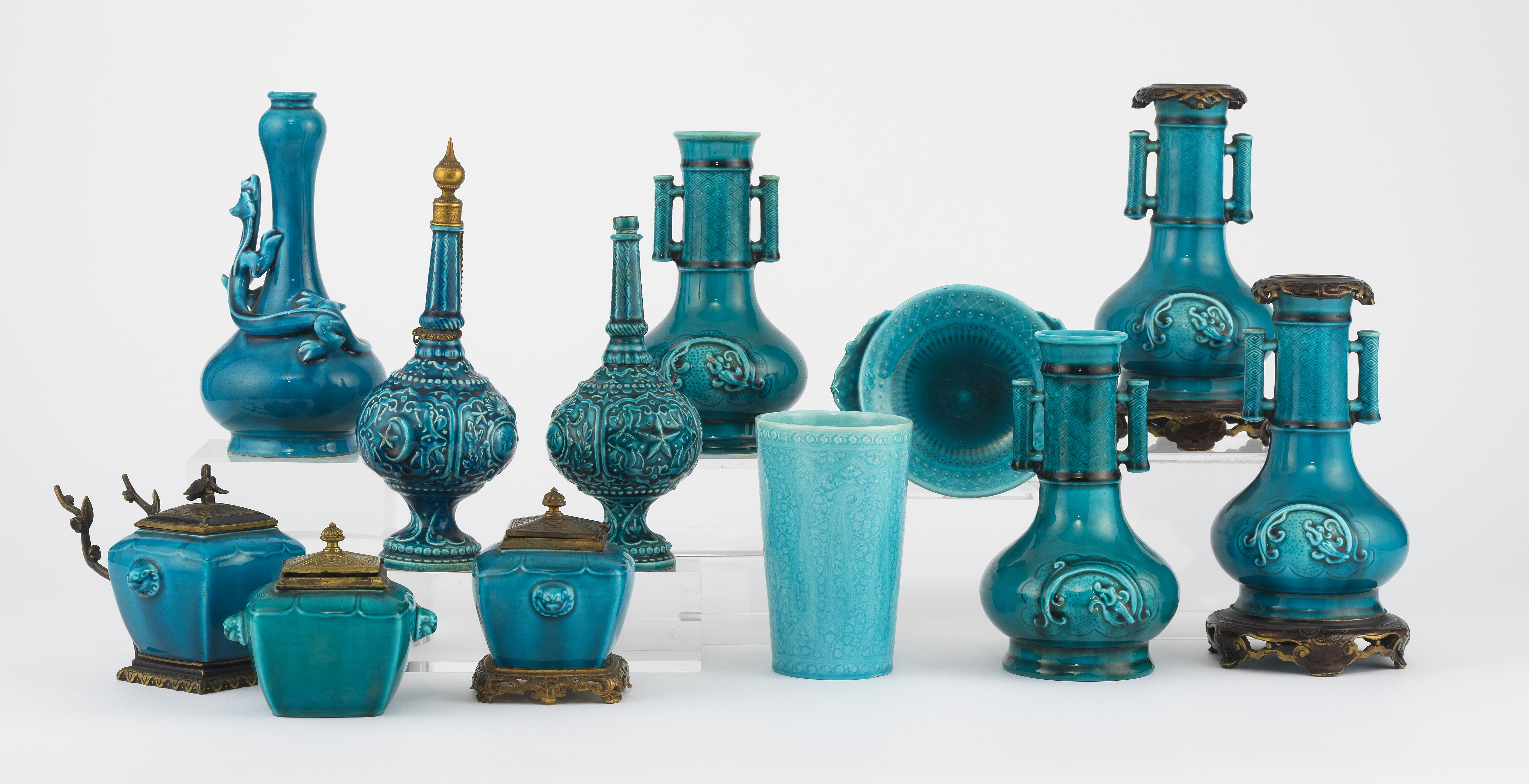 Ensemble de 12 pièces ( encrier, vase, coupelle,etc) faïence tur...