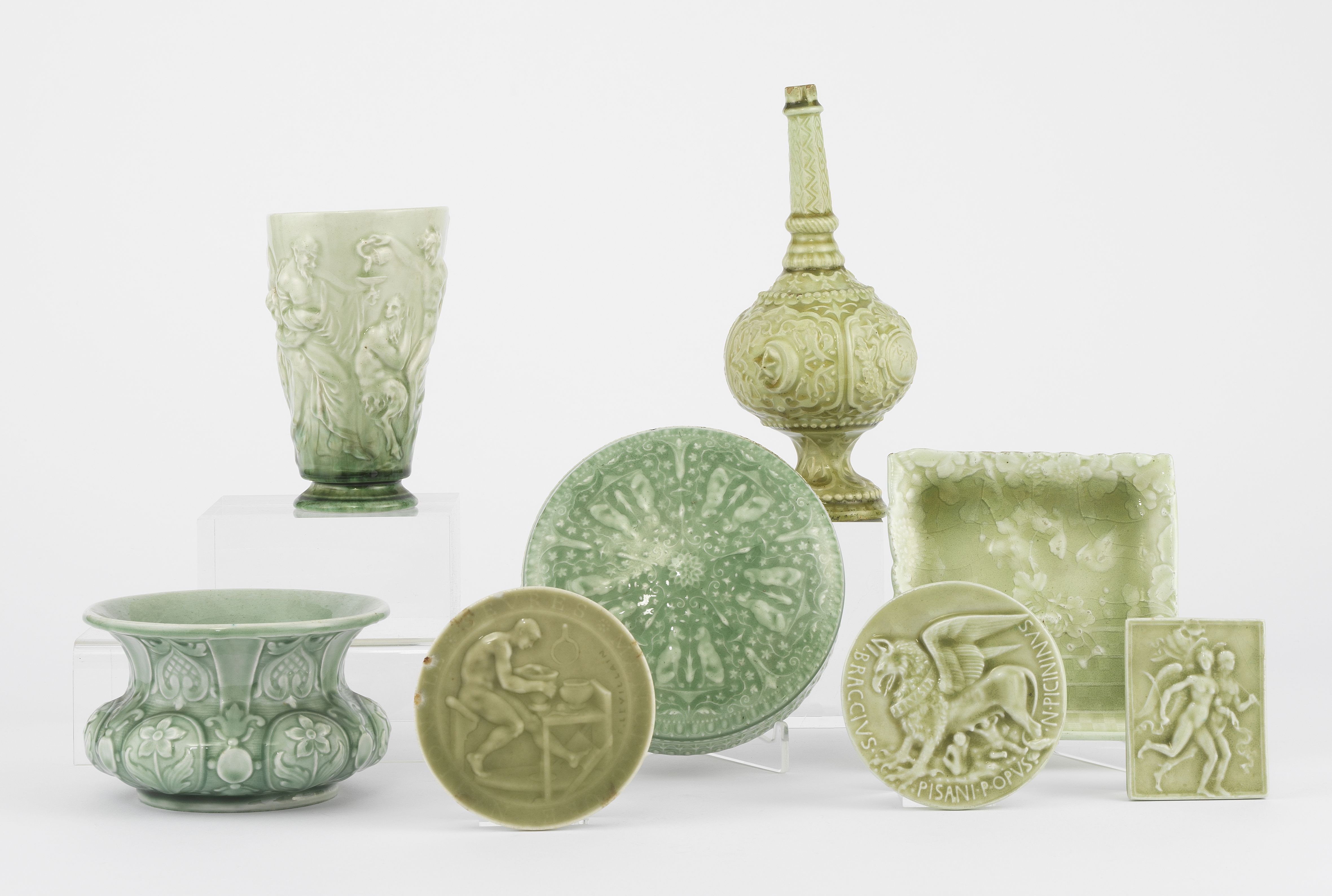 Suite de 8 pièces en faïence émaillée céladon, signées, L 7 à 19...