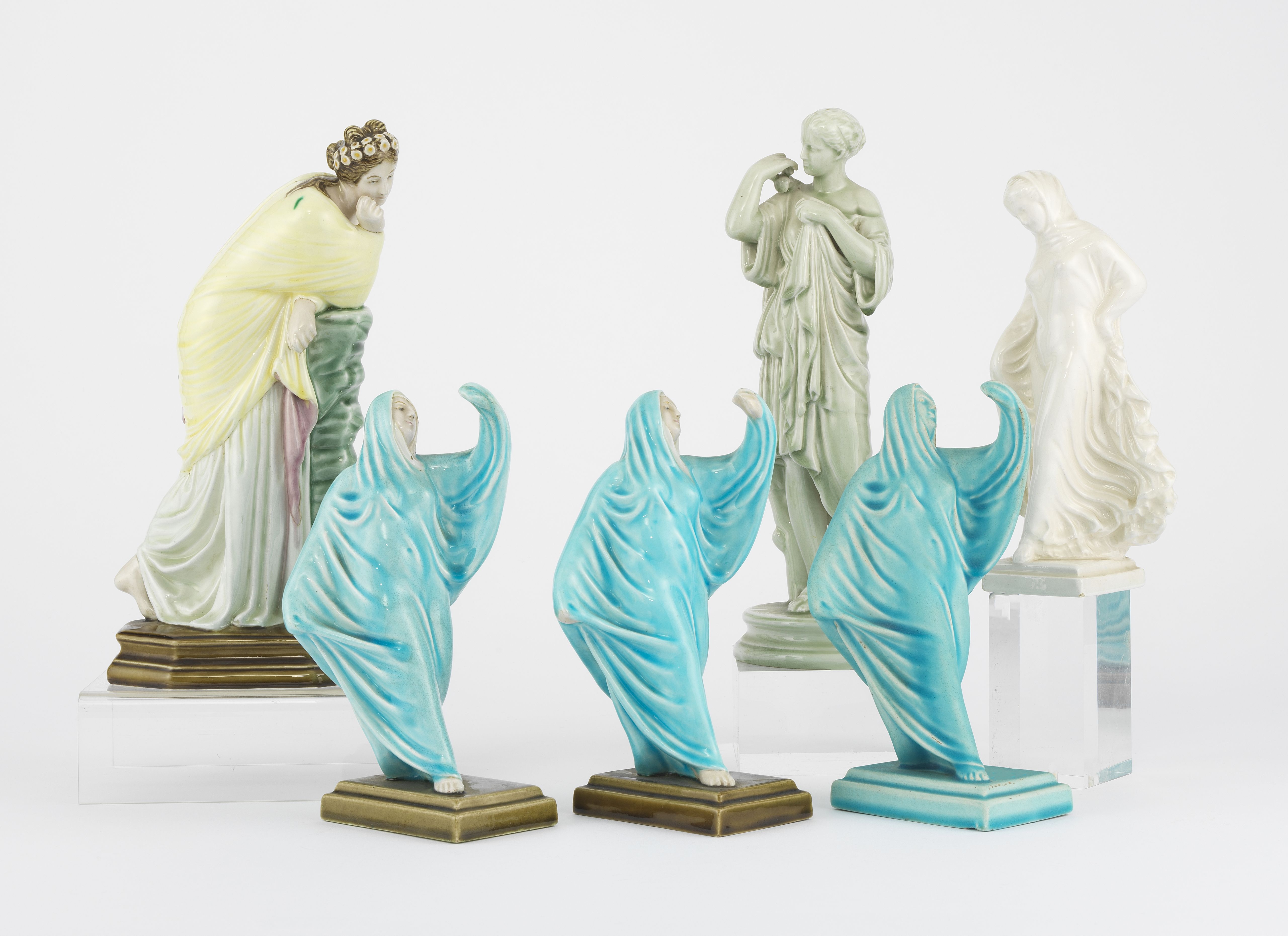 Collection de 6 figurines, Tanagra, faïence émaillée blanc et po...