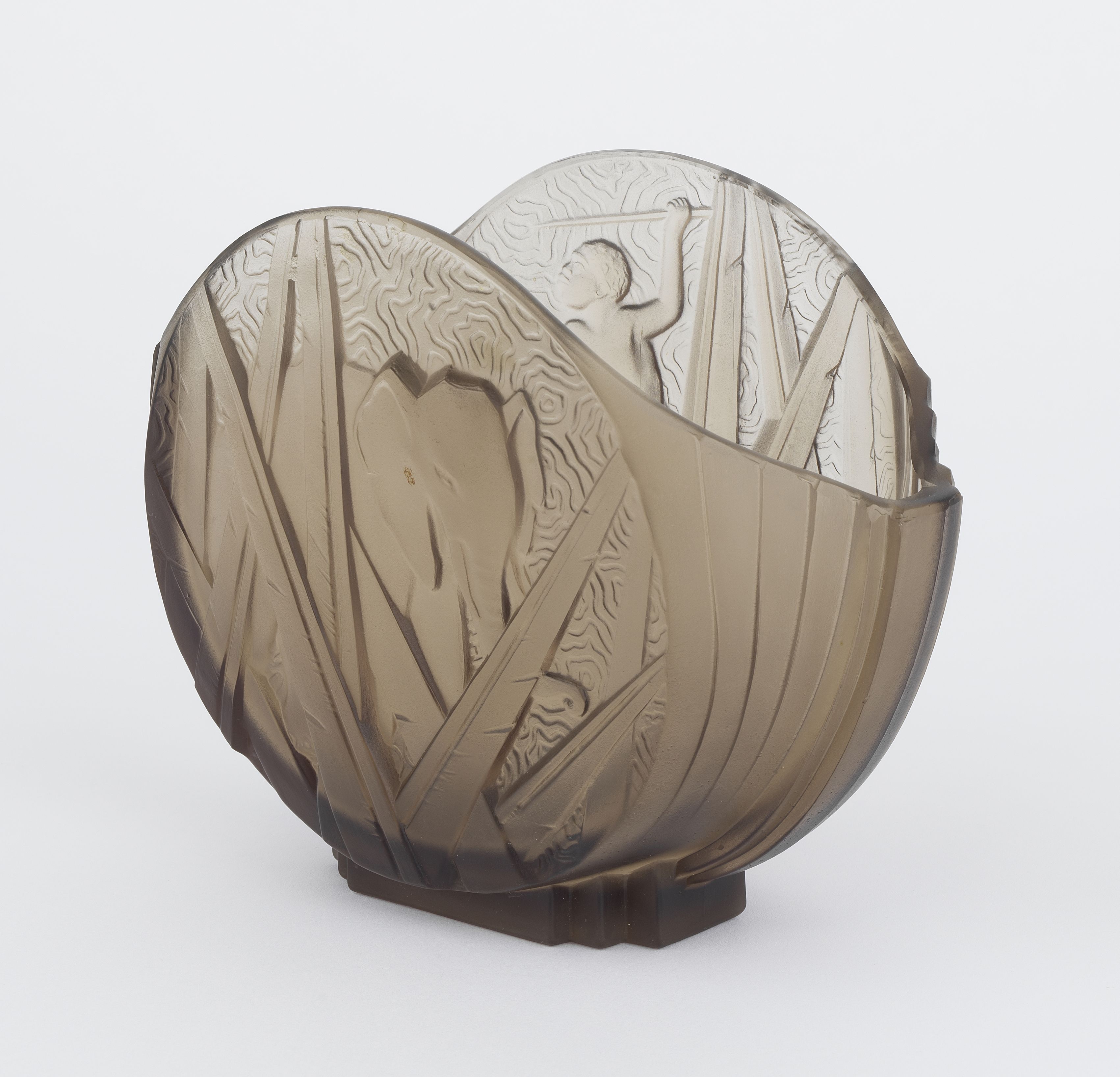 Verre opaque à motif d'éléphants et chasseurs, H 14 cm. Provenan...