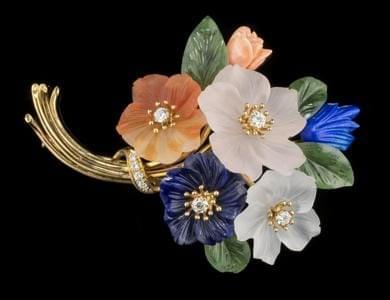 4106. Broche à motif de bouquet de fleurs en pierres dures sculptées