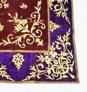 Soie et fils dorés à motifs de rinceaux sur fond pourpre, 84x84...