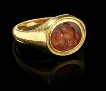 4940. Bague sertie d'une intaille sur cornaline à décor de scène d'off...