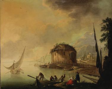 Retour de pêche devant un temple en ruine, huile sur toile, 71x9...