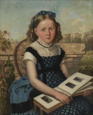 Jeune fille à l'album photos, huile sur toile, signée, 71x57 cm