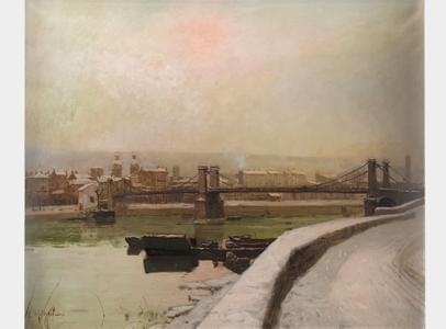Paysage de bord de lac en hiver, étude, huile sur toile monogram...