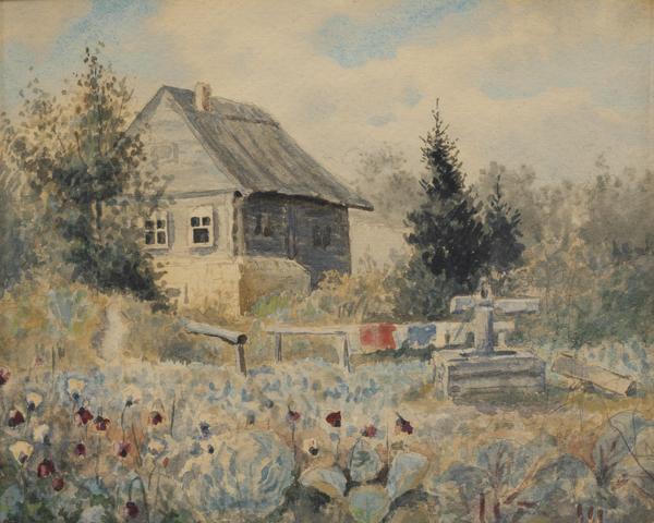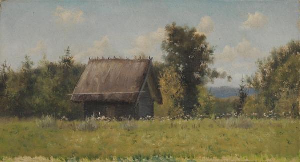 Datcha dans la prairie, huile sur papier, 14x26 cm. Provenance:...