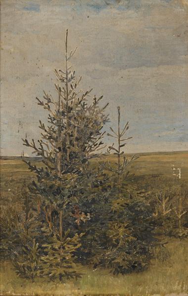 Jeunes sapins, huile sur toile marouflée sur carton, 19,5x12,5 c...