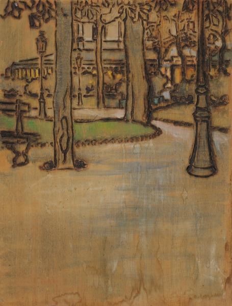 Parc, bois pyrogravé et gouache, 27x20,5 cm. Provenance: Famille...