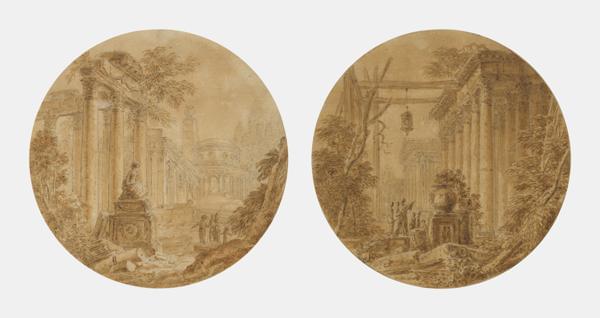 Deux ruines animées en tondeau, paire de lavis, D 8,5 cm