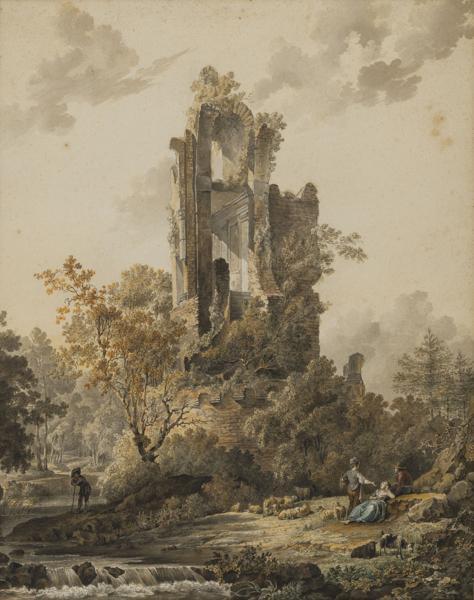 Ruine animée avec berger, aquarelle, 40x32 xm