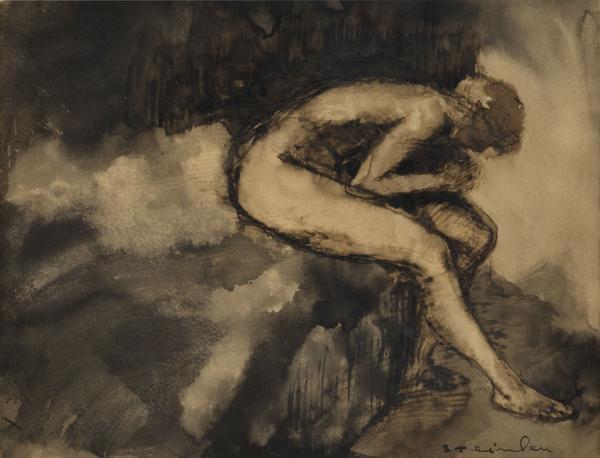 Femme assise, encre et lavis sur papier, signé, 20x26 cm