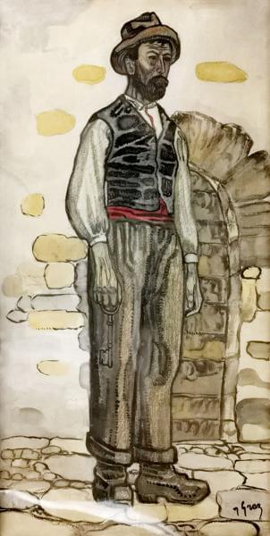 Homme barbu tenant une clef, aquarelle, crayon et encre sur papi...