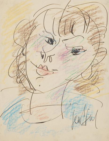 Tête de femme, crayon de couleur et encre de Chine, 21x27 cm