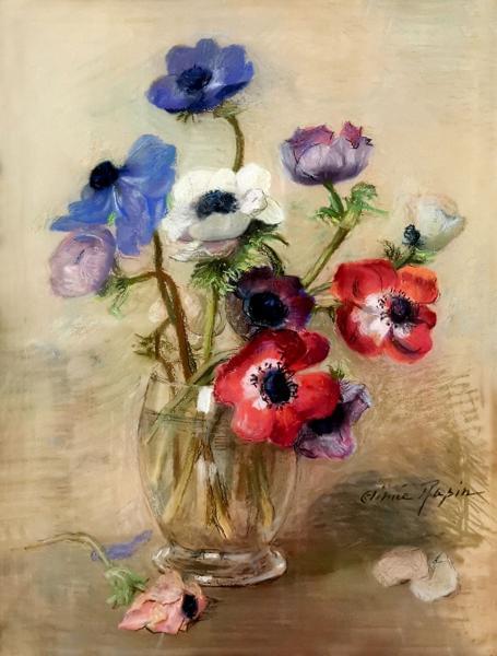Bouquet d'anémones, pastel sur papier, signé, 42x31 cm