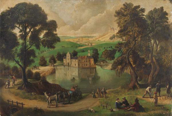 Scènes devant un château, huile sur panneau, 74x110 cm