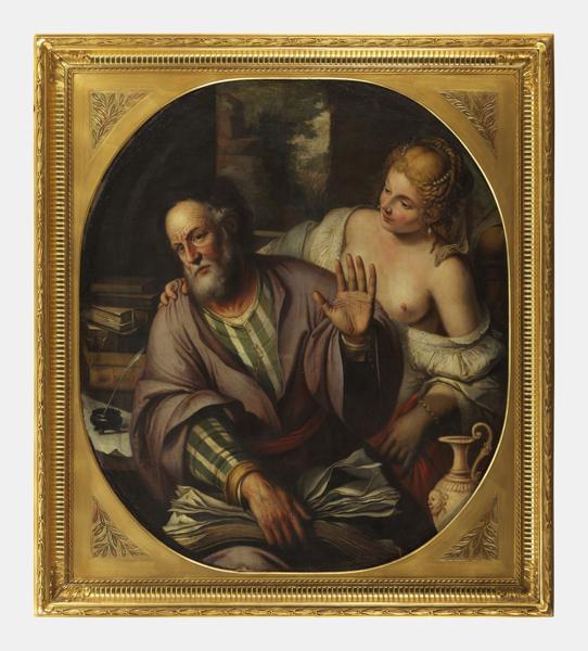 Philosophe et femme aux seins nus, huile sur toile, 118x102 cm