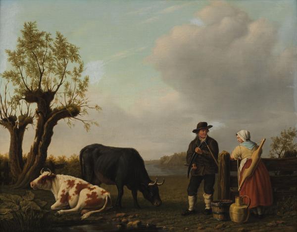 Couple de paysans et deux vaches, huile sur panneau, signée, 36x...