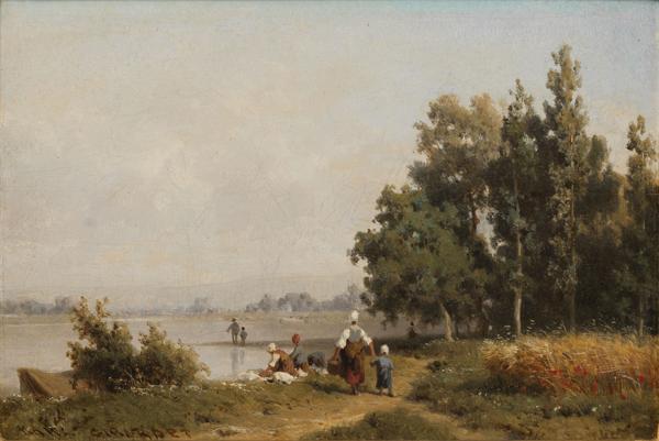 Lavandières à la rivière, huile sur panneau, signée, 18x27 cm