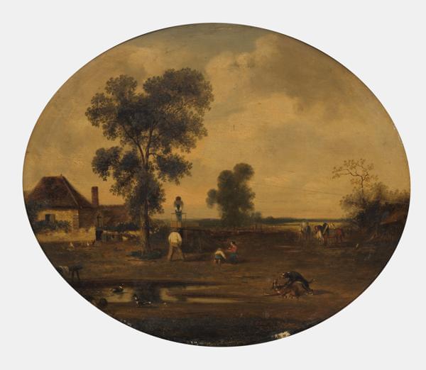 Scène animée dans une ferme, huile sur panneau, 43x53 cm