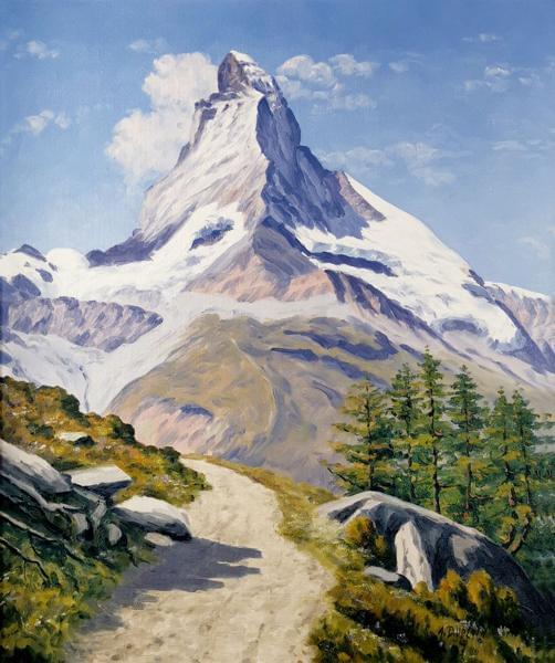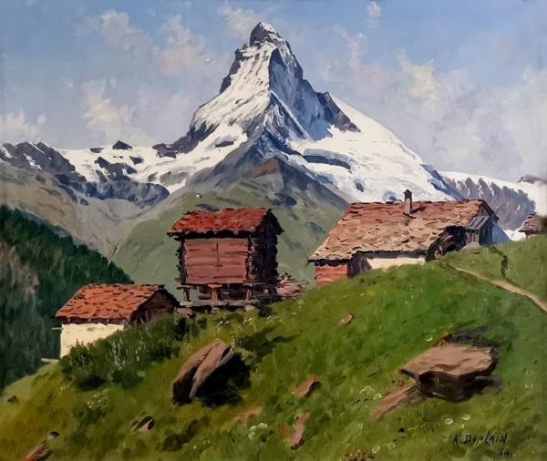 Mazots devant le Cervin, huile sur toile signée, 46x55 cm