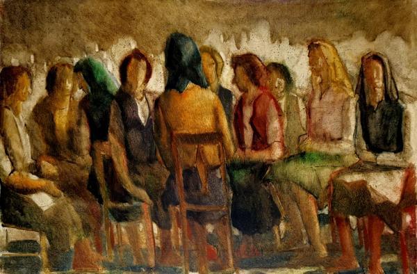 Femmes sur un chemin, huile sur toile signée, 61x40 cm