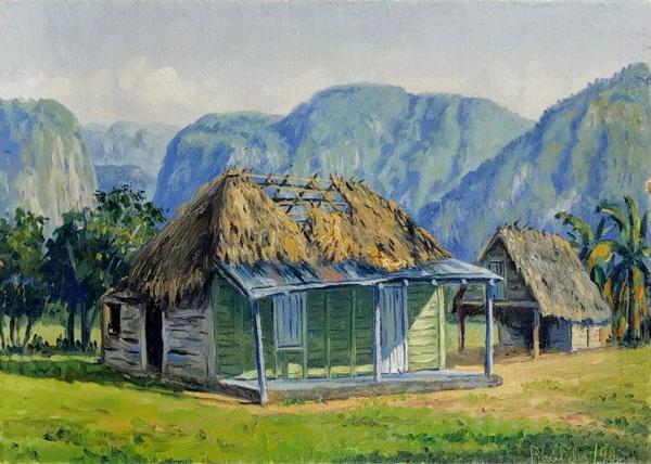 Paysage avec cabanes, huile sur toile, signature illisible, 20x2...