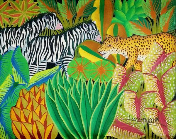 Zèbre et léopard, huile sur toile, signée, 20x26 cm
