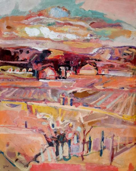 Paysage coloré, huile sur pavatex, signée et datée 70, 50x74 cm