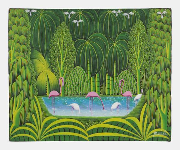Paysage avec des flamands roses, huile sur toile, signée, 51x61...