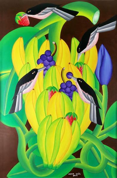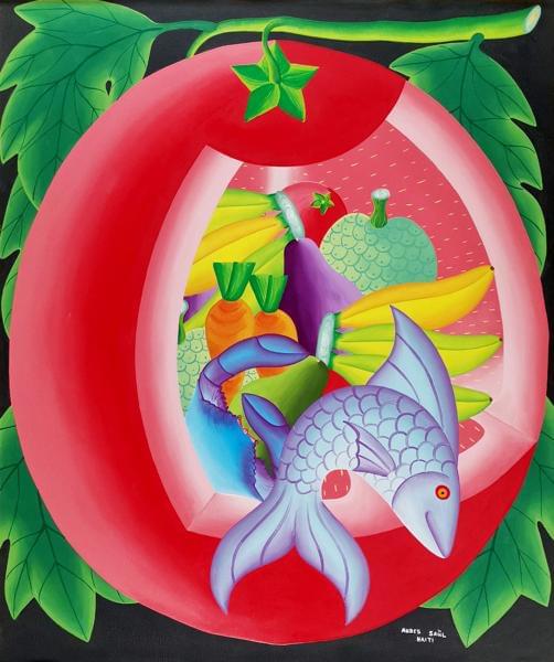 Fruits et poisson, huile sur toile, signée, 83x70 cm