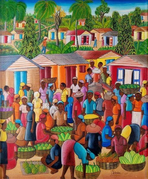 Personnages au marché, huile sur toile marouflée sur panneau, 59...
