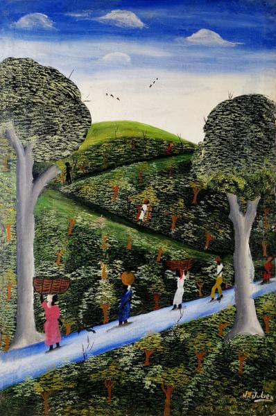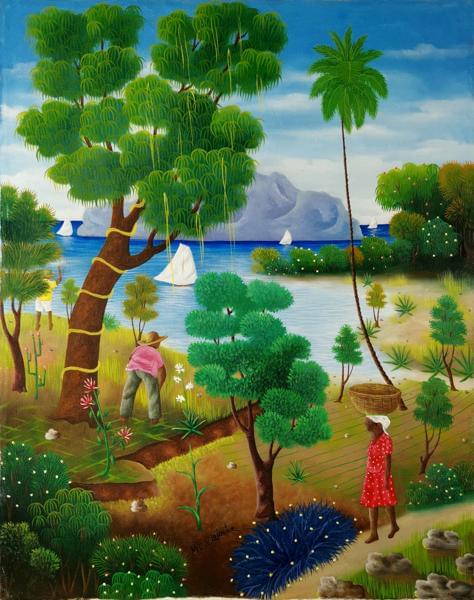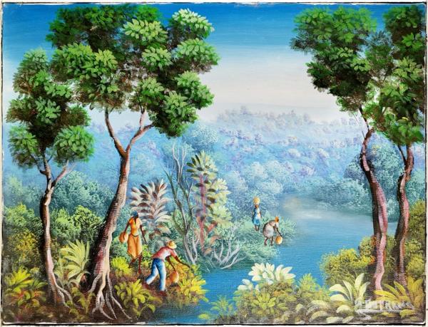 Couple traversant la rivière et femmes aux champs, huile sur toi...